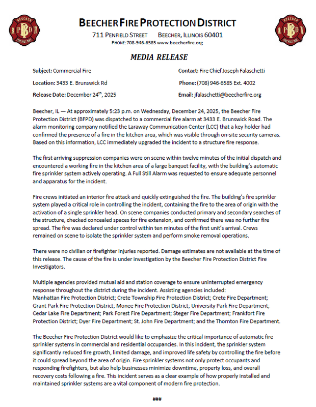 | Beecher, IL — At approximately 5:23 p.m. on Wednesday, December 24, 2025, the Beecher Fire Protection District (BFPD) was dispatched to a commercial fire alarm at 3433 E. Brunswick Road. The alarm monitoring company notified the Laraway Communication Center (LCC) that a key holder had confirmed the presence of a fire in the kitchen area, which was visible through on-site security cameras. Based on this information, LCC immediately upgraded the incident to a structure fire response.